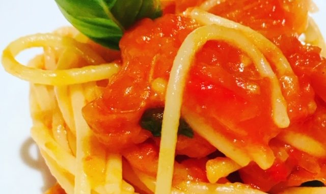 Lessare per 5 min gli spaghetti in acqua bollente salata e tuffarli nella padella , far continuare la cottura sia alla pasta che al pomodoro , girando per amalgamare il tutto , unire il basilico fresco e portare a cottura .
