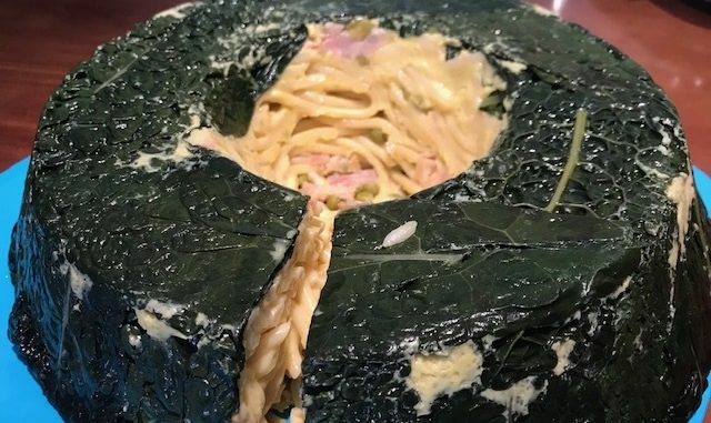 Ungere uno stampo circolare con del burro , foderarlo con le foglie del cavolo nero , versare la pasta con il composto e richiudere con altre foglie .