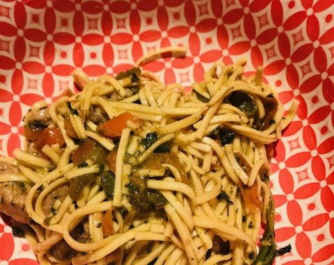 Lessare i noodles ed aggiungerli alle verdure , mescolare il tutto . Aggiungere la soia ed amalgamare il tutto .