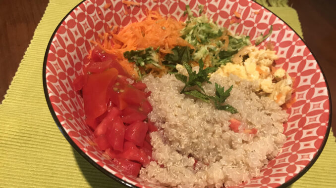 In una ciotola mettere la quinoa aggiustata di sale, olio e limone, le carote le zucchine , le uova e il pomodoro , aggiungere un po di menta